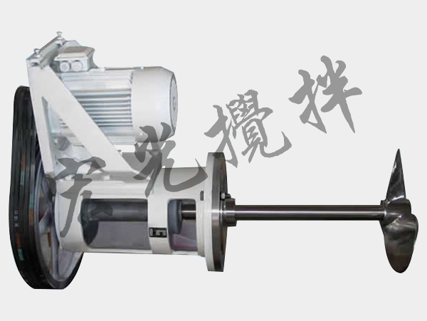 側入式皮帶攪拌機是將攪拌裝置安裝在設備筒體的側壁上,攪拌機上的攪拌器通常采用軸流型,以推進式攪拌器為多,在消耗同等功率情況下,能得到好的攪拌效果,功率消耗為頂攪拌的1/3~2/3,成本為頂攪拌的1/4~1/3。轉速可在200~750r/min。